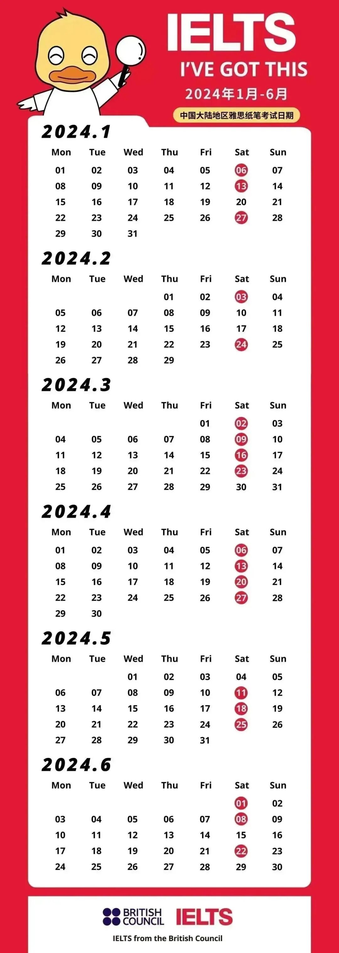 接下来,momo老师就为大家奉上新鲜出炉的2024年1月-6月雅思考试日历,